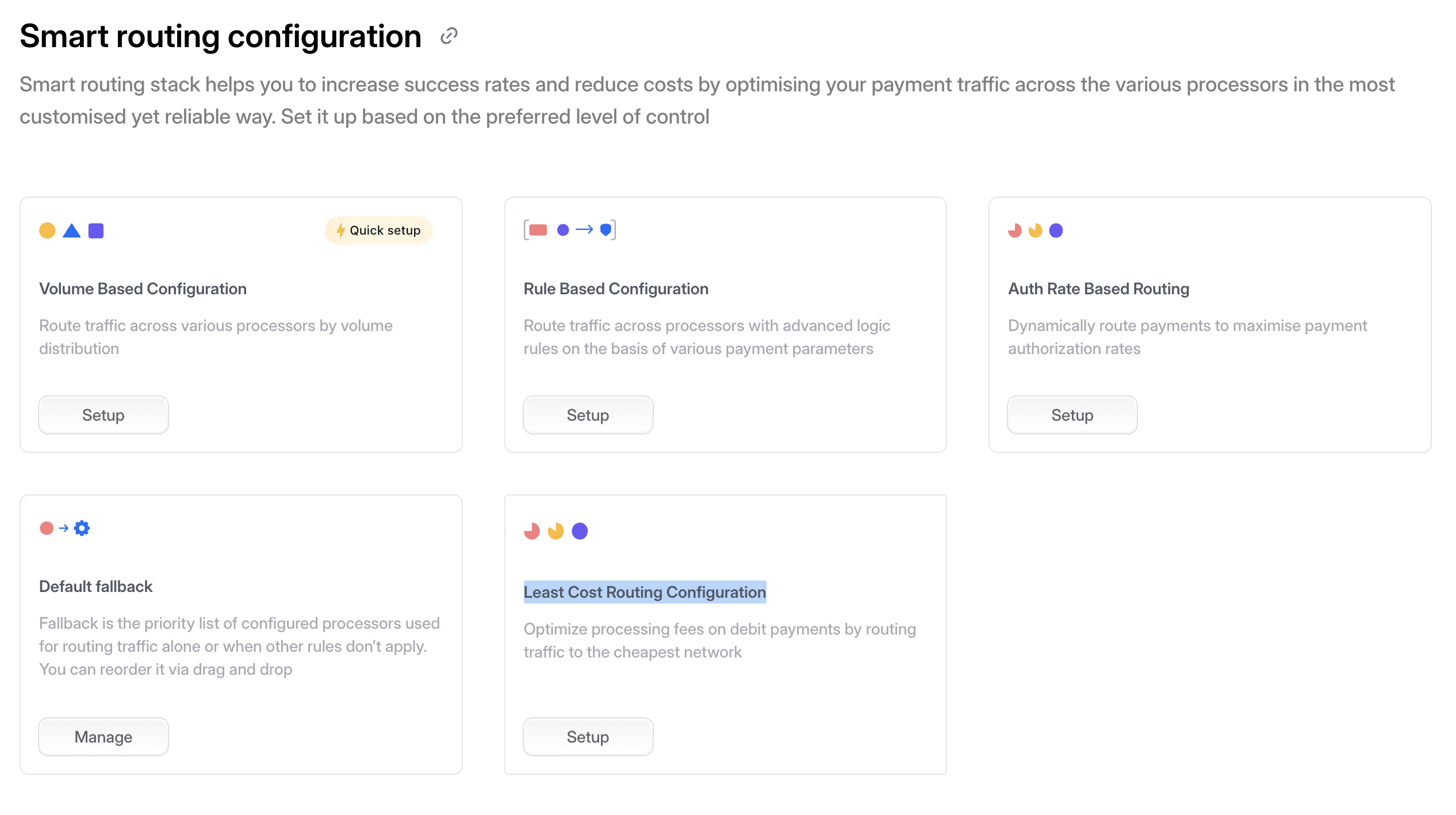 ***Step 4:*** Once enabled, you can view Least Cost Routing as your active routing algorithm along with all previously configured algorithms on the [Hyperswitch Dashboard](https://app.hyperswitch.io/routing)