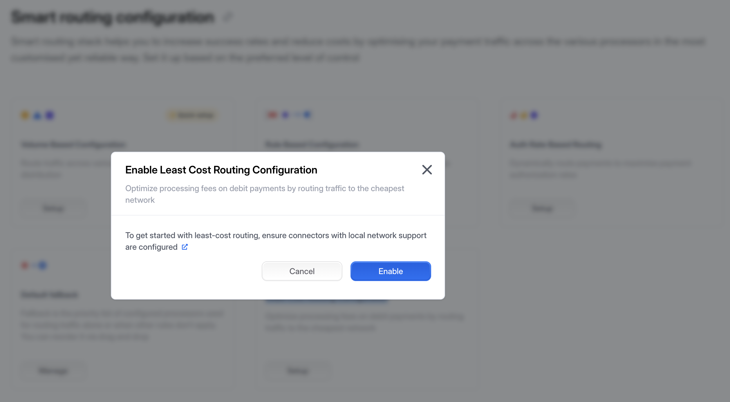 ***Step 3:*** A popup will guide you to confirm the three prerequisites - 1.) Connector setup, 2.) Debit card enablement, and 3.) Local networks configuration. Click on `Enable` to activate LCR