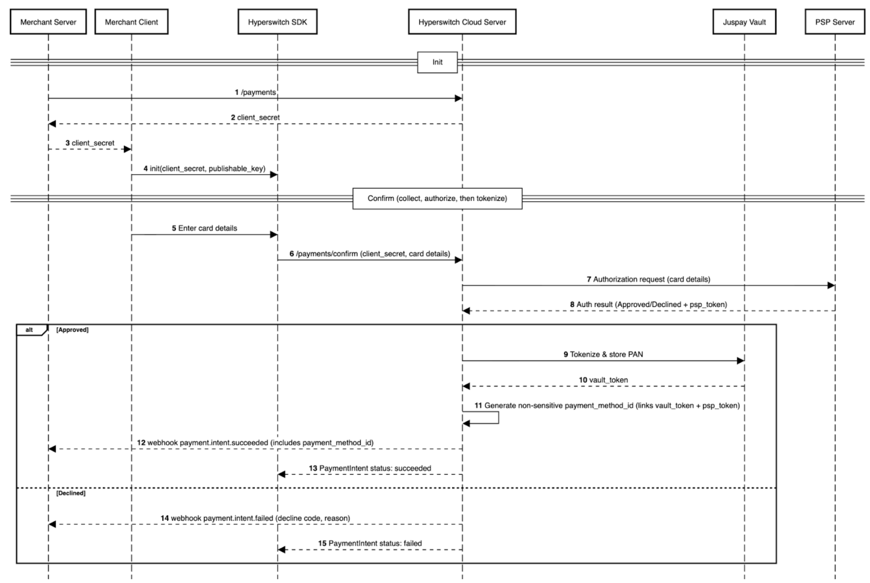 4. Once the PSP responds with the outcome `approved` or `declined` along with the PSP token, Hyperswitch then proceeds to store and tokenize the card.