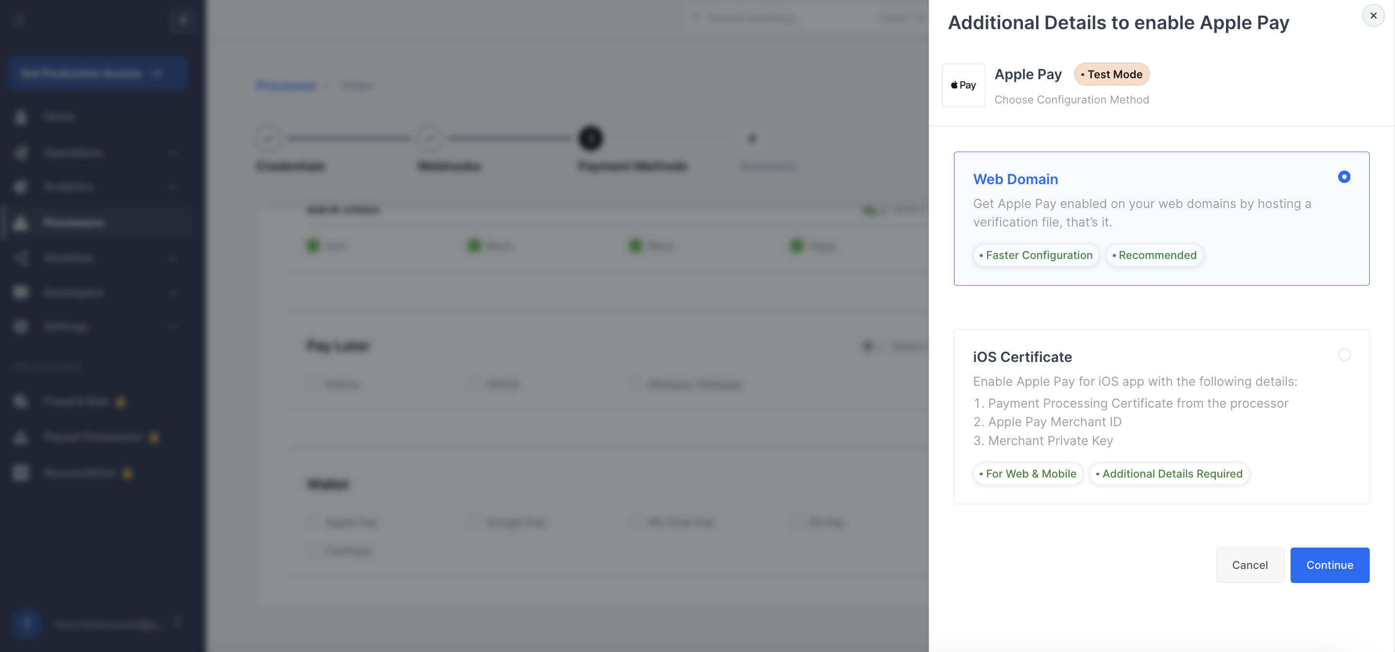 Please note since the Apple Pay Web Domain flow involves decryption at Hyperswitch, you may need to write to your payment processor to get this feature enabled for your account. Stripe is one among them.
