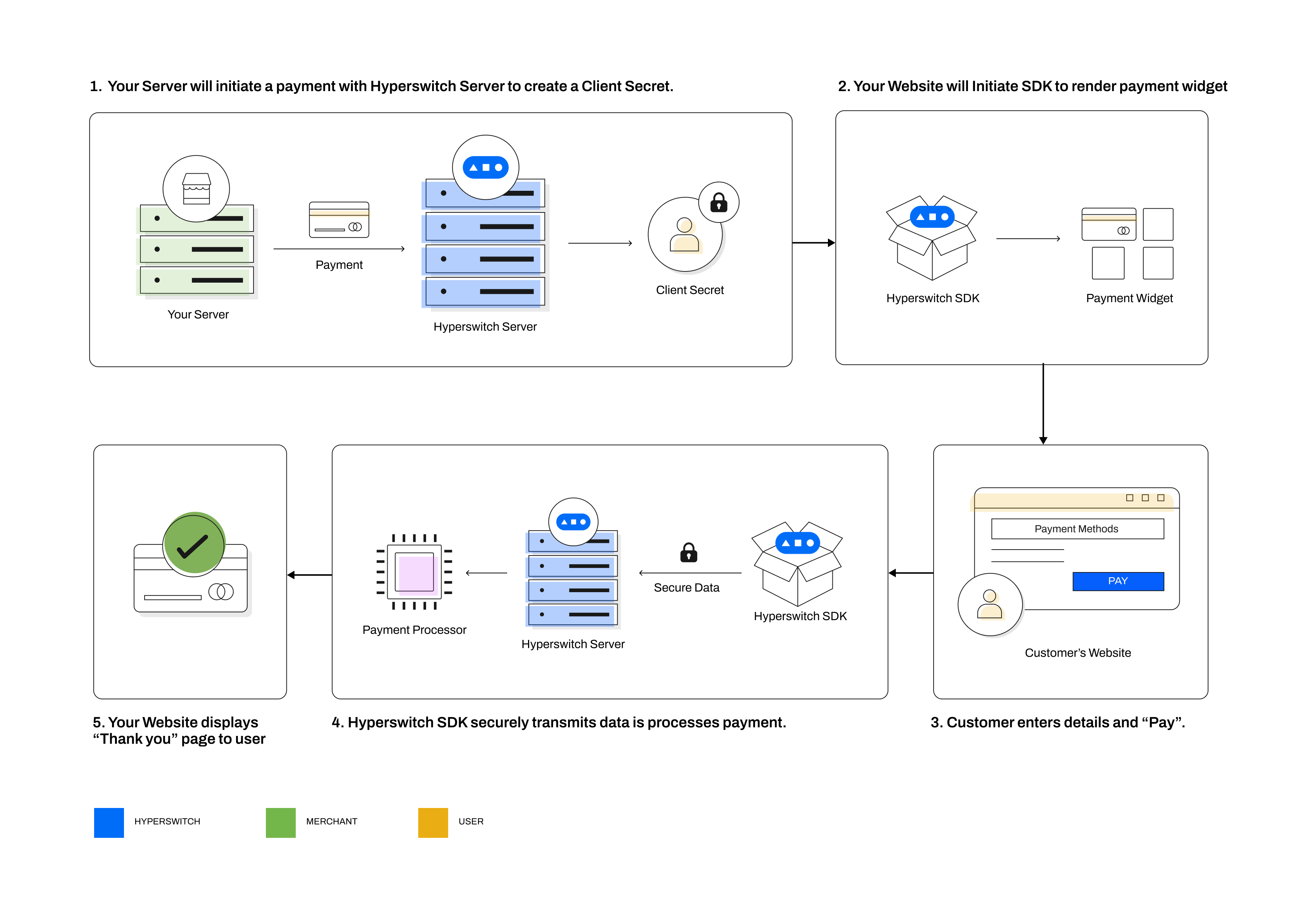 You will use both a server-side and a client-side component of Hyperswitch to complete the integration. The payment flow begins once your user adds products to a shopping cart and wishes to make a payment.
